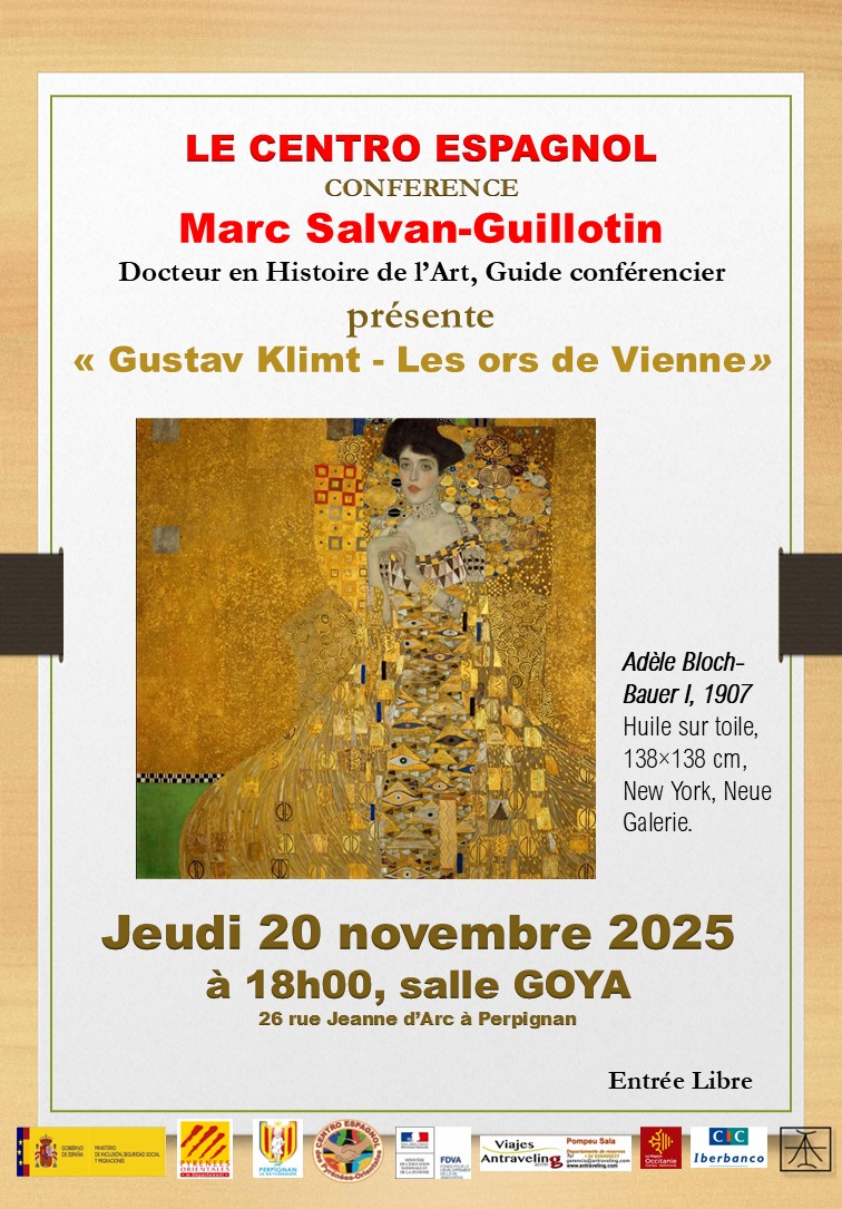 Jeudi 20 novembre à 18h, salle Goya, conférence de Marc Salvan-Guillotin, docteur en histoire de l’art, guide conférencier : Gustav Klimt – les ors de Vienne : Entrée libre.