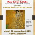 Conférence de Marc Salvan-Guillotin Gustav Klimt20 novembre 2025Jeudi 20 novembre à 18h, salle Goya, conférence de Marc Salvan-Guillotin, docteur en histoire de l’art, guide conférencier : Gustav Klimt – les ors de Vienne : Entrée libre. lire la suite
