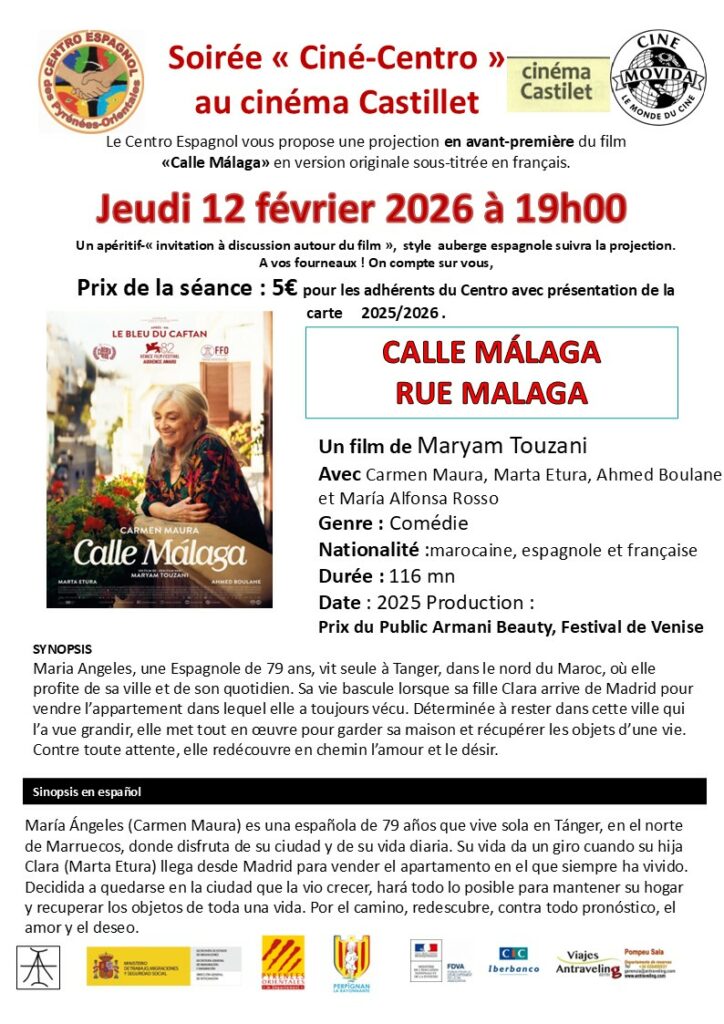 Ciné centro « rue Malaga »29 janvier 2026Jeudi 12 février à 19h au cinéma Castillet, ciné centro, projection en avant-première du film de Maryam Touzani « Rue Malaga », comédie dramatique, prix du public à la Mostra de Venise 2025. Auberge espagnole après la séance, 5 € avec la carte d’adhérent. lire la suite
