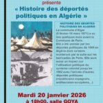 Conférence de Monique Hernandez-Roussel5 janvier 2026Mardi 20 janvier à 18h salle Goya, conférence de Monique Hernández-Rousselet « Histoire des déportés politiques en Algérie ». Entrée libre. lire la suite