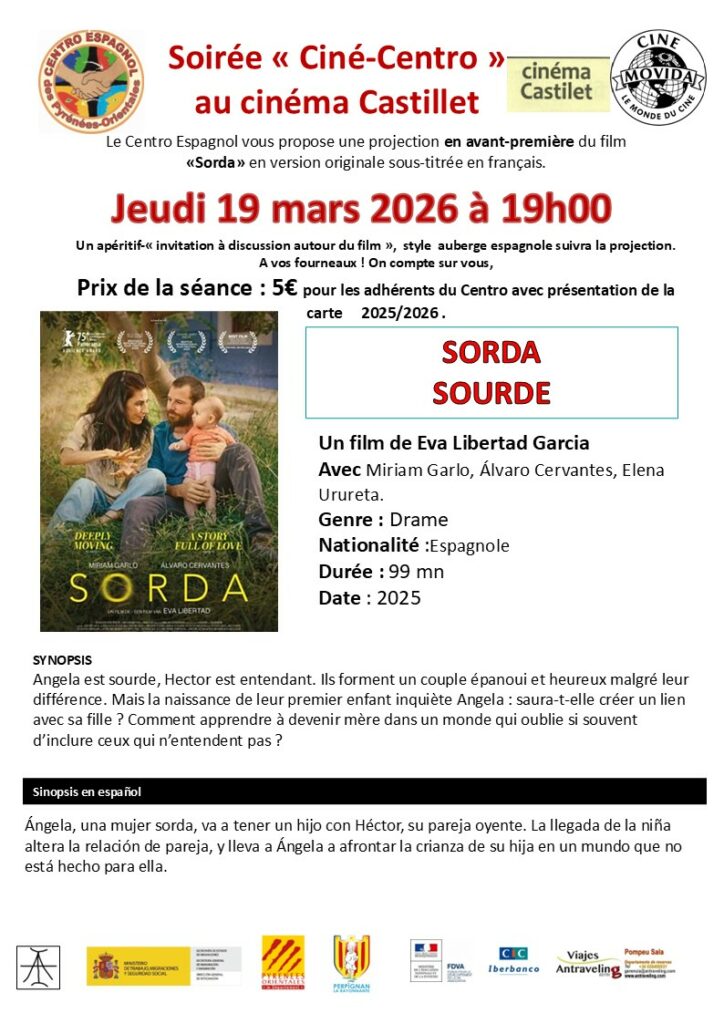 Ciné centro « Sorda »22 février 2026Jeudi 19 mars au cinéma Castillet à 19h ciné centro, projection en avant-première du film espagnol de Eva Libertad Garcia « Sorda ». Auberge espagnole après la séance. Entrée 5 € pour les adhérent.es. lire la suite
