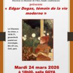 Conférence « Edgar Degas »22 février 2026Mardi 24 mars à 18h salle Goya, conférence de Marc Salvan-Guillotin, docteur en histoire de l’art, guide conférencier « Edgar Degas, témoin de la vie moderne ». Entrée libre. lire la suite
