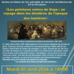 Conférence « Goya »31 mars 2026Mardi 7 avril, à 18 h, conférence d’Alexandre Charrett-Dykes , docteur en histoire de l’art, spécialiste de l’art et de l’architecture des XVIe et XVIIe siècles « les peintures noires de Goya : un voyage dans les ténèbres de l’époque des lumières ». lire la suite