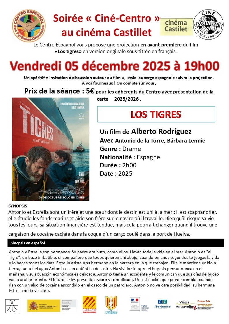 Vendredi 5 décembre à 19h au cinéma Castillet, projection en avant-première du film (thriller) « Los tigres » de Alberto Rodriguez, cinéaste espagnol aux multiples récompenses. La projection sera suivie d’un auberge espagnole.