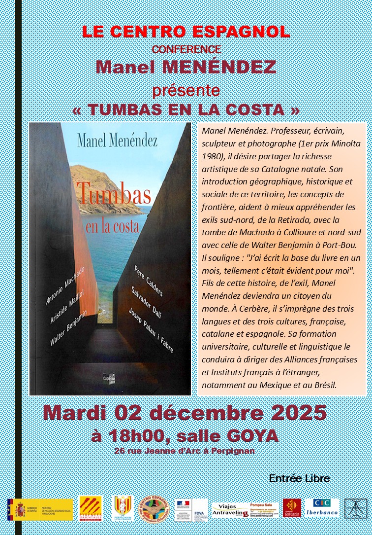 Mardi 2 décembre, Manuel Menendez nous a présenté son dernier livre « Tumbas en la costa » celles entre Collioure et Cadaques, de Machado, Maillol, Benjamin, Caldera, Dali et Pau i Fabre. Conférence très intéressante, enrichie de nombreuses anecdotes et partage avec le public.