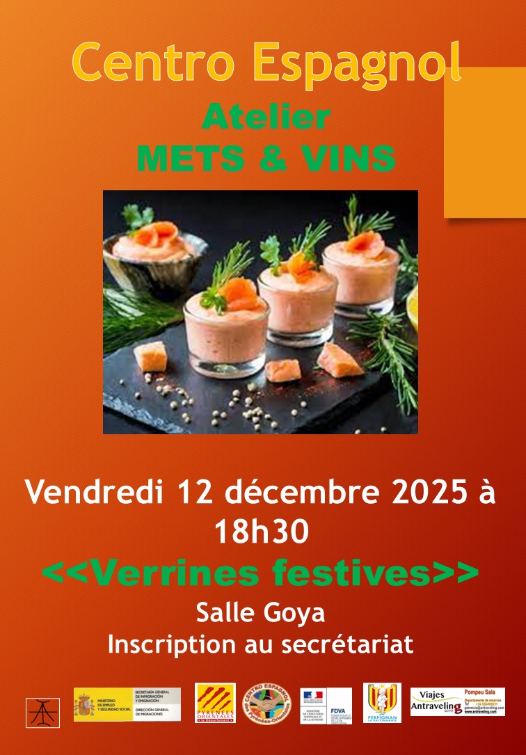 Vendredi 12 décembre à 18h30, salle Goya : « Verrines festives ». Inscriptions et paiement au secrétariat (23 €). Attention ! nombre de places limité.
