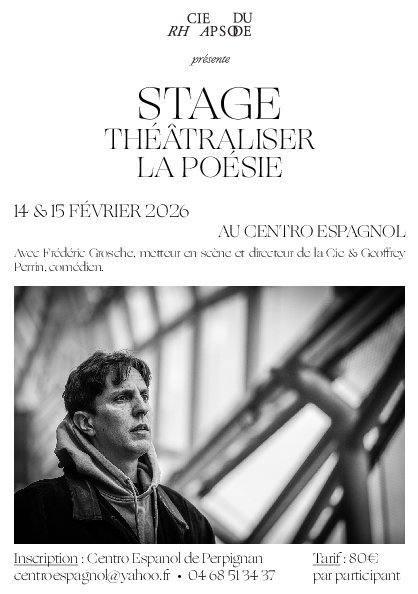 Samedi 21 février, de 14h à 17h, dimanche 22 février de 10h à 17h, la compagnie du Rhapsode (avec Frédéric Grosche, metteur en scène et directeur de la Cie, et Geoffrey Perrin, comédien) propose un stage de théâtre : « Théâtraliser la poésie ». Inscription au secrétariat, participation, 80 € par personne.