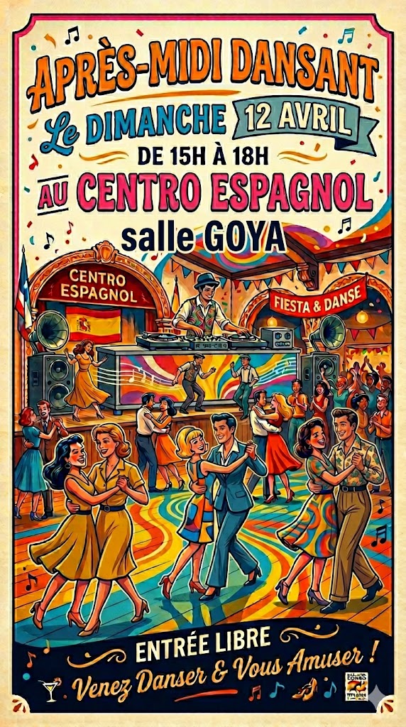 Dimanche 12 avril de 15 à 18 heures, salle Goya, après-midi dansant. Animation Jacques et Laurent. Rock N’roll, variétés françaises 80-90, madison, disco, ambiance tropicale, chachacha, tango, paso… Entrée libre et gratuite. Venez nombreux participer à cet événement exceptionnel.