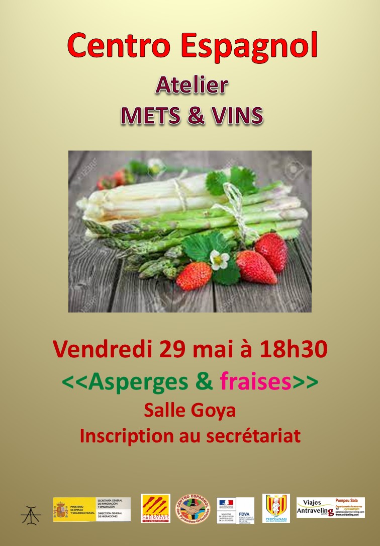 Vendredi 29 mai à 18h30, salle Goya, atelier Mets et vins » Eveil du printemps, de l’asperge à la fraise ». Inscription au secrétariat.