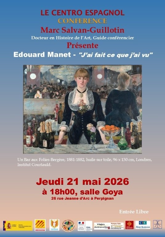 Jeudi 21 mai, salle Goya à 18h, conférence de Marc Salvan-Guillotin, historien de l’art, guide conférencier, « Edouard Manet, j’ai fait ce que j’ai vu ». Entrée libre.